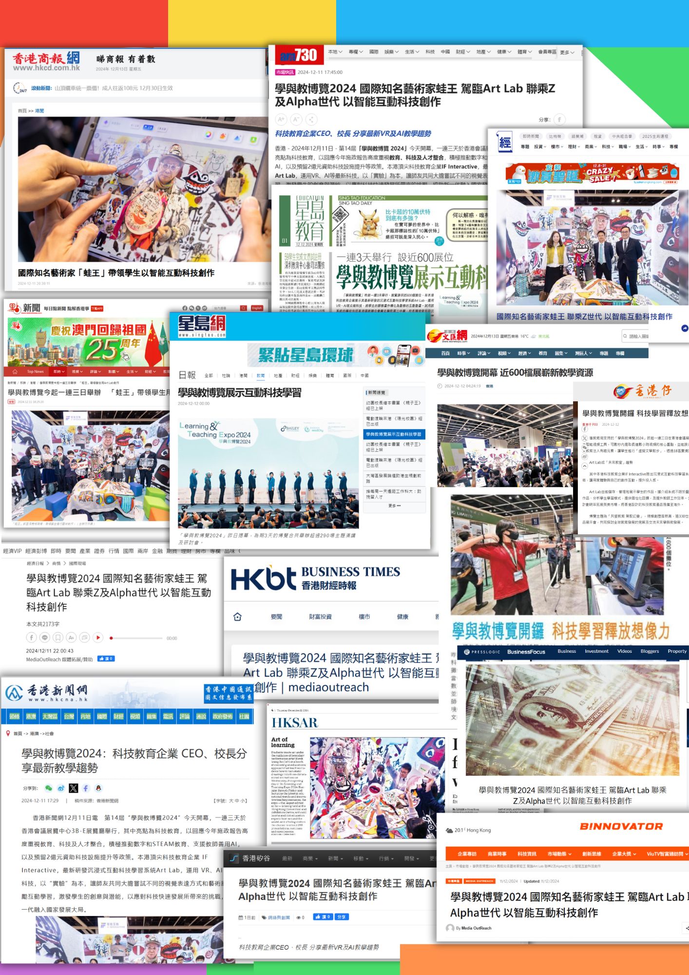 2024年12月11日,智能互動舉辦的 「Art Lab x 知名藝術家『蛙王』:以沉浸式互動科技聯乘中小學生創作」活動,以全新形式展現教育科技與藝術的結合,成功吸引超過30間主流媒體報導,包括星島日報、文匯報、香港仔 - LION ROCK DAILY、點新聞、am730、香港商報、ET Net及經濟一週等,成為教育界與藝術界關注的焦點。此次活動不僅推動沉浸式科技的應用,更為中小學生創意教育帶來突破性啟發,標誌著香港科技教育創新發展的新篇章。